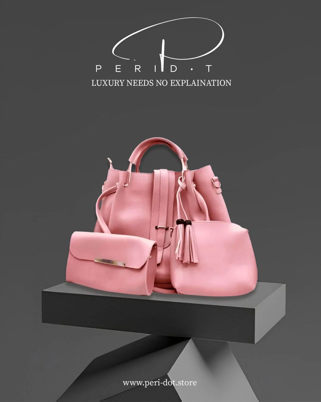 Add a pop of elegance and versatility to your wardrobe with this Elegant 3-in-1 Handbag Set in a soft blush pink. Crafted with high-quality faux leather and gold-tone hardware, this set includes: